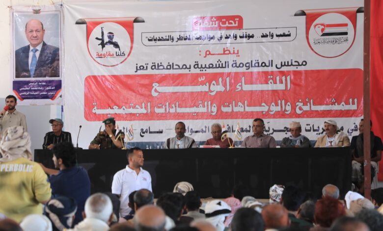 وفي اللقاء، الذي نظمه مجلس المقاومة الشعبية بالمحافظة تحت شعار: “شعبٌ واحد.. موقفٌ واحد في مواجهة المشروع السلالي”، حيّا رئيس المجلس الأعلى للمقاومة الشعبية الشيخ حمود سعيد المخلافي الوجاهات والقيادات المشاركة، مؤكدًا أهمية استمرار المقاومة الشعبية بزخم متجدد يواكب حجم التحديات، داعيًا إلى اصطفاف وطني شامل في مواجهة جماعة الحوثي باعتبارها الخطر الأكبر على اليمن.
