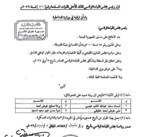 أشادت الدكتورة شفيقة سعيد عبده، رئيسة اللجنة الوطنية للمرأة، بالقرار الجمهوري رقم (31) لسنة 2026م الصادر عن فخامة رئيس مجلس القيادة الرئاسي، الدكتور رشاد محمد العليمي، والقاضي بترقية عدد من الكوادر النسائية في وزارة الداخلية إلى رتبة “عميد”.