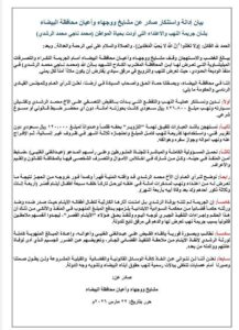 وشدد البيان على أن أبناء محافظة البيضاء لن يقفوا مكتوفي الأيدي أمام هذه القضية، ولن يسمحوا – بحسب تعبيرهم – بأن تتحول المنافذ السيادية إلى أوكار للابتزاز والنهب والتعسف، مؤكدين أنهم سيلجؤون إلى كافة الوسائل القانونية والقضائية والقبلية المشروعة حتى يتم رد الاعتبار للضحية وإنصاف أسرته ومحاسبة الجناة.