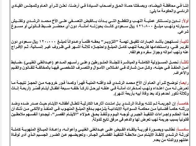 وأوضح البيان أن المواطن الرشدي كان يحمل مبلغًا ماليًا قدره 426,800 ريال سعودي على سبيل الأمانة، قبل أن يتعرض – بحسب البيان – لعملية مصادرة ونهب دون أي محضر ضبط قانوني أو مسوغ شرعي، في واقعة وصفها مشايخ ووجهاء البيضاء بأنها “جريمة مكتملة الأركان”.