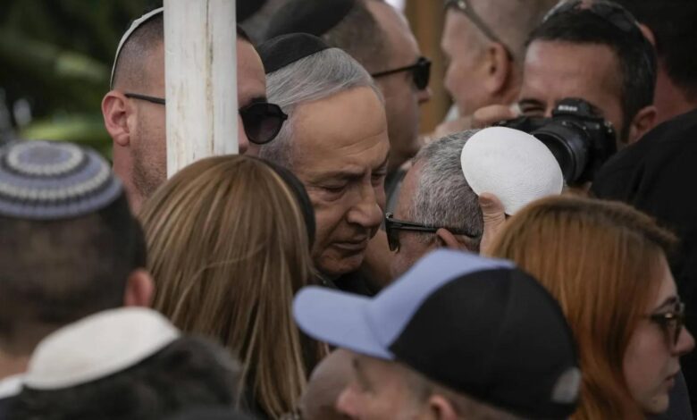 بنيامين نتنياهو يقدم العزاء لغادي آيزنكوت في مقتل ابنه بمعارك غزة يوم 8 ديسمبر 2023 (أ.ب)