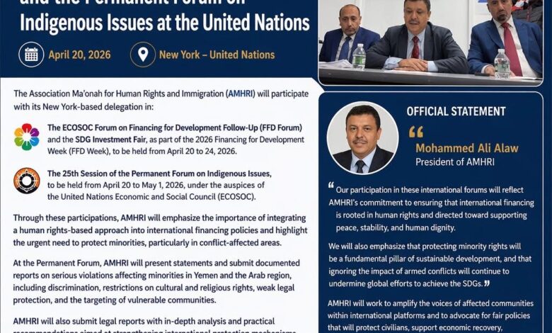During the Forum sessions, AMHRI will deliver statements and submit reports highlighting serious violations affecting minorities in Yemen and the Arab region, including discrimination based on identity, restrictions on cultural and religious rights, weak legal protections, and the targeting of vulnerable communities in conflict settings.
