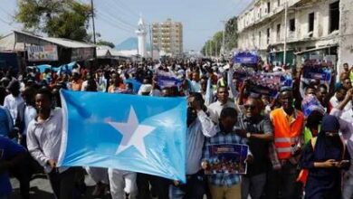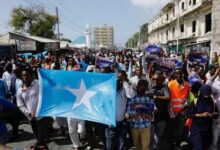 صوماليون خلال مسيرة مناهضة لاتفاق بين إثيوبيا وأرض الصومال في استاد ياريسو في مقديشو، الصومال.…