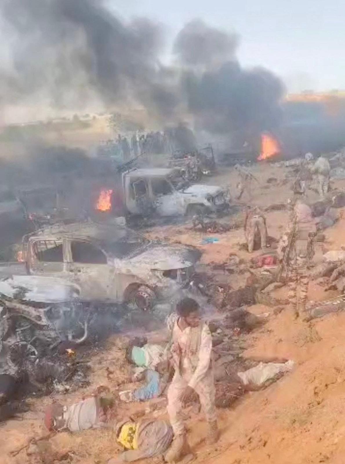 أفراد من «قوات الدعم السريع» يسيرون وسط الجثث والمركبات المحترقة بالقرب من الفاشر (رويترز) عين…