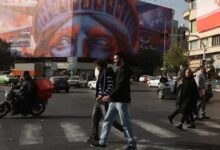 إيرانيون في أحد شوارع طهران أمام لوحة دعائية تنتقد الولايات المتحدة. 5 نوفمبر 2025 –…
