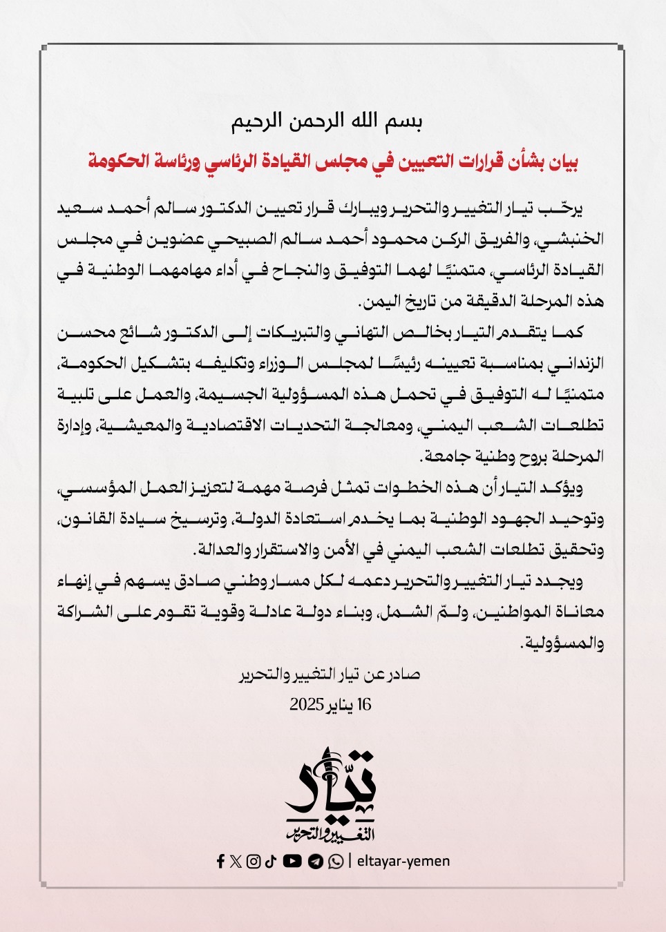 تيار التغيير والتحرير يرحّب بقرارات تعيين الصبيحي والخنبشي أعضاء في مجلس القيادة الرئاسي والزنداني رئيس للحكومة