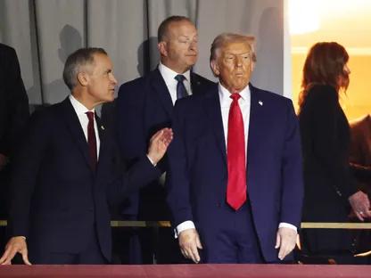 الرئيس الأميركي دونالد ترمب ورئيس وزراء كندا مارك كارني قبل قرعة كأس العالم 2026 في…