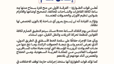 عين اخبار الوطن أعلنت قوات الطوارئ – الفرقة الأولى، عن منح فترة سماح محددة بـ24 ساعة لكافة القاطرات والشاحنات…