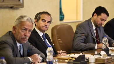 غروسي (وسط) ونائبه ماسيمو أبارو الذي يترأس إدارة الضمانات في «الذرية الدولية» على هامش مباحثات مع إسلامي في أصفهان مايو…