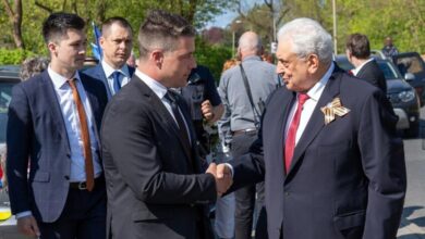 روبرت نيتز (يسار)، عمدة سيلو، يرحب بالسفير الروسي لدى ألمانيا، سيرجي نيتشايف (يمين)، خلال حفل إحياء الذكرى الثمانين لمعركة مرتفعات…