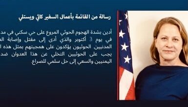 السفارة الأمريكية في اليمن تدين “الهجوم الصاروخي الحوثي المروع على حي سكني في مارب”