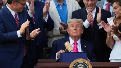 رئيس مجلس النواب الأميركي مايك جونسون (يسار) يصفق بينما يمسك الرئيس دونالد ترمب بالمطرقة بعد توقيعه على قانون الإنفاق والضرائب…