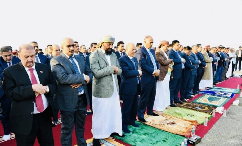 رئيس مجلس القيادة الرئاسي الدكتور رشاد العليمي يؤدي مع نوابه وقيادات الدولة صلاة عيد الفطر في عدن