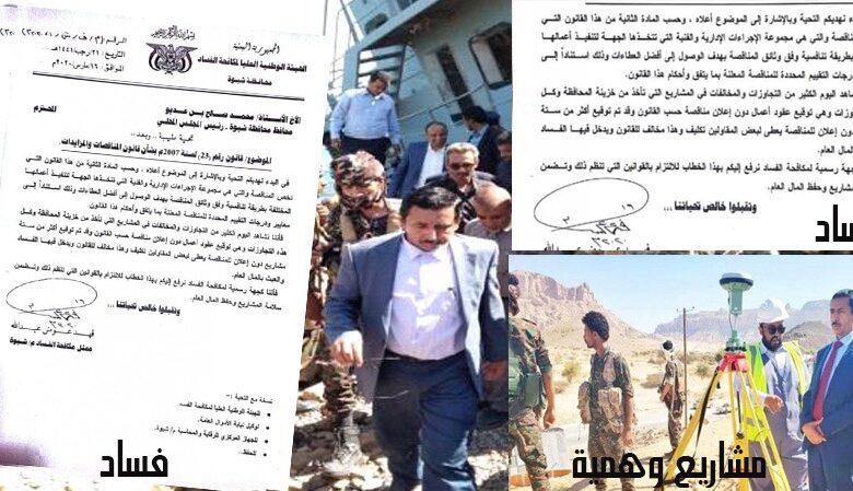 أظهرت وثائق محدودة التداول تورّط محافظ شبوة السابق المنتمي لحزب التجمّع اليمني الإصلاح (ذراع جماعة الاخوان المسلمين في اليمن) محمد صالح بن عديو، في قضية فساد كبيرة متعلّقة بإهدار ملايين الدولارات المخصّصة لـ 251 مشروعاً تنموياً وخدمياً في المحافظة خلال فترة تولّيه منصبه بين نوفمبر 2018 وديسمبر 2021.