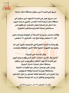 وتبين أن النيران اشتعلت بالكنيسة، مما أسفر عن مصرع شخص، وإصابة آخرين، فيما بدأ رجال الحماية المدنية في محاصرة الحريق وإخماده.