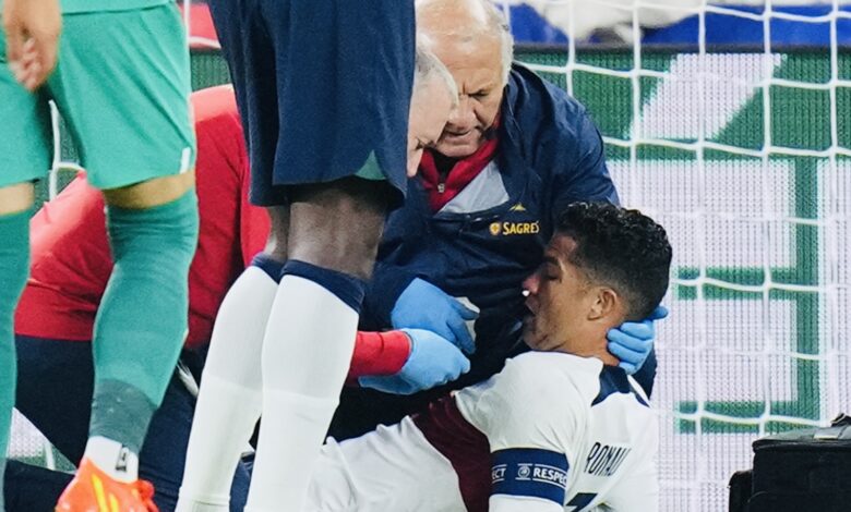 تعرض النجم البرتغالي كريستيانو رونالدو لإصابة شديدة في الوجه خلال مباراة منتخب بلاده ضد التشيك المقامة الآن، في الجولة الخامسة من دور المجموعات في مسابقة دوري الأمم الأوروبية.