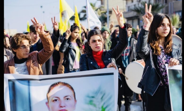 ورفع المشاركون في التظاهرة التي دعت إليها الإدارة الذاتية صور القتلى الثلاثة، وهم رجلان وامرأة. وحمل موسيقيون آلاتهم خلف صورة لعازف بين قتلى الاعتداء.