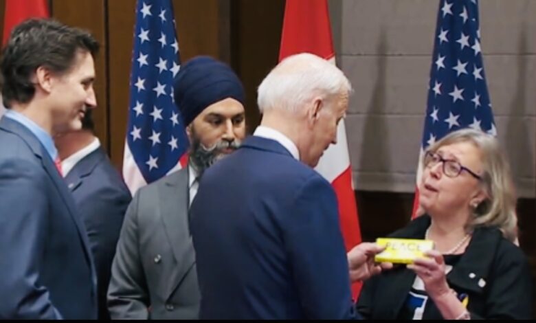 On his first visit to Canada, President Biden just received his @Peacebychoco and requested it back after he finished signing a book. Huge Thanks @ElizabethMay and PM @JustinTrudeau 🇨🇦🇺🇸 pic.twitter.com/OWA12fXiFM— Tareq Hadhad (@TareqHadhad) March 24, 2023
