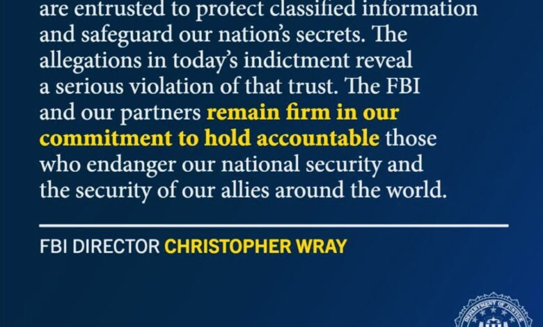 “Individuals granted security clearances are entrusted to protect classified information and safeguard our nation’s secrets. The allegations in today’s indictment reveal a serious violation of that trust,” said FBI Director Christopher Wray. “The FBI and our partners remain firm in our commitment to hold accountable those who endanger our national security and the security of our allies around the world.”
