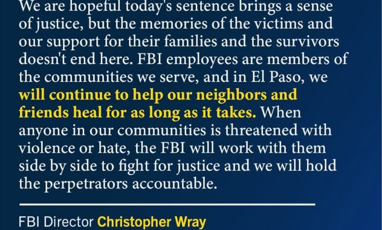 “We are hopeful today’s sentence brings a sense of justice, but the memories of the victims and our support for their families and the survivors doesn’t end here,” said FBI Director Christopher Wray. “FBI employees are members of the communities we serve, and in El Paso, we will continue to help our neighbors and friends heal for as long as it takes. When anyone in our communities is threatened with violence or hate, the FBI will work with them side by side to fight for justice and we will hold the perpetrators accountable.”