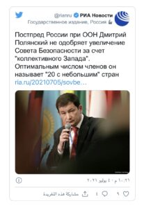 وأضاف بوليانسكي، في حديث صحفي: “نحن نركز على أن أي إصلاح لمجلس الأمن الدولي، يجب أن يحظى بأوسع موافقة ممكنة، وأن يؤدي إلى تكوين أكثر توازنا للمجلس. نشير علانية ومباشرة إلى أننا ضد زيادة عدد دول الغرب الجماعي في مجلس الأمن الدولي، ويشمل ذلك ألمانيا واليابان”.