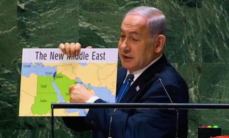 وأشار إلى اتفاقات السلام سواء مع مصر والأردن قبل عقود أو الاتفاقات الأخيرة عام 2020. وقال للحضور في قاعة الجمعية العام: “والآن أنظروا ماذا سيحدث عندما نبرم السلام مع السعودية” وعندها قلب اللوحة على وجهها الثاني فظهرت منطقة واسعة باللون الأخضر محيطة بإسرائيل وأجاب: “سيتغير الشرق الأوسط كله”.