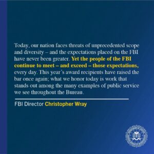 “Today, our nation faces threats of unprecedented scope and diversity—and the expectations placed on the FBI have never been greater,” Director Wray said. “Yet the people of the FBI continue to meet—and exceed—those expectations, every day. This year’s award recipients have raised the bar once again; what we honor today is work hat stands out among the many examples of public service we see throughout the Bureau.”