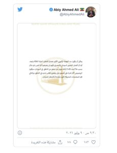 وقال رئيس وزراء إثيوبيا في رسالة وجهها للشعبين المصري والسوداني عبر موقع التدوينات القصيرة تويتر: “يمكن أن يكون سد النهضة الإثيوبي الكبير مصدرا للتعاون بين دولنا الثلاث وأبعد. أود أن أطمئن الشعبين السوداني والمصري أنهم لن يتعرضوا أبدا لضرر ذي شأن بسبب ملء السد، لأنه لن يأخذ سوى جزء صغير من التدفق. في السودان سيكون الروصيرص أكثر قدرة على الصمود ولن يخضع لتقلب شديد بسبب التدفق، وبالتالي فإن المجتمعات المحيطة تكون مطمئنة بالازدها المتبادل”.