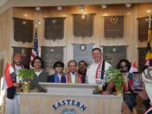 و كان مسك ختام التظاهرة في مقر شرطة بالتيمور حيث تم استقبال أفراد الجالية من طرف قائدها الميجور جاي تاكر شخصيا عند المدخل بإبتسامة ترحيبية تدل على الاحترام الذي تحظى به الجالية، و هو ما أكد عليه في الكلمة التي ألقاها على الحضور مثنيا على الدور الإيجابي الذي يلعبه اليمنيون في بالتيمور و جعلها مدينة رخاء وأمن.