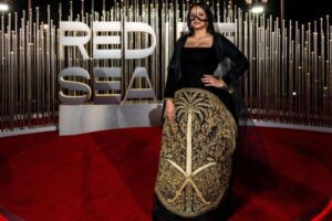 سائقة الرالي السعودية مها الحملي، تقف على السجادة الحمراء عند وصولها للعرض في جدة، كجزء من النسخة الثالثة من مهرجان البحر الأحمر السينمائي، المملكة العربية السعودية 5 ديسمبر 2023