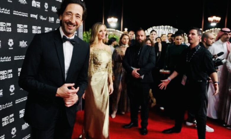 الممثل الأمريكي أدريان برودي وزوجته الممثلة الأمريكية جورجينا تشابمان يقفان على السجادة الحمراء للحفل الختامي للنسخة الثالثة من مهرجان البحر الأحمر السينمائي الدولي في جدة، السعودية 07 ديسمبر 2023.