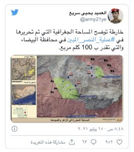 وذكر المتحدث باسم قوات الجماعة يحيى سريع أن قوات “أنصار الله” خلال هذه العملية سيطرت على مساحة تقدر بـ100 كلم مربع في مديريتي الصومعة والزاهر في محافظة البيضاء، مشيرا إلى سلاح الجو المسير والقوة الصاروخية التابع للحوثيين نفذ ضمن إطار عملية “النصر المبين” 66 عملية.