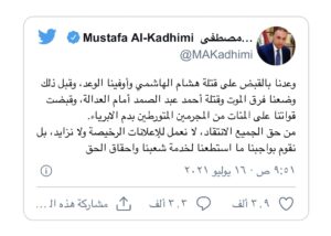 وتعهد الكاظمي خلال زيارة أجراها لمنزل الهاشمي بعد يومين من اغتياله بالقصاص من القتلة لتنفيذهم “الجريمة الجبانة”.