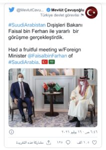 وسبق لتشاووش أوغلو وقال عقب لقاء جمعه بنظيره السعودي مؤخرا: “أود أن أوجه الشكر لأخي الأمير فيصل على دعوته وكرم الضيافة. عقدنا اجتماعا منفتحا وصريحا للغاية، وتناولنا بعض الإشكاليات في علاقاتنا”.