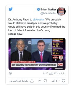 جاءت تصريحات فاوتشي، بعد انتقاد الرئيس الأميركي، جو بايدن، الجمعة، المعلومات المضللة على وسائل التواصل الاجتماعي حول كوفيد-19 والتطعيمات وقال إنها “تقتل الناس”.
