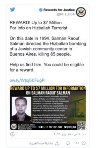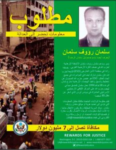 وجدد برنامج مكافآت وزارة الخارجية الأمريكية للعدالة دعوته للمساعدة على إلقاء القبض على سلمان، وقال إنه “مسؤول عن تخطيط وتنسيق وتنفيذ هجمات إرهابية خارج لبنان، استهدفت إسرائيليين وأمريكيين”.