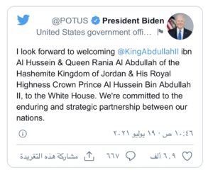 قال الرئيس الأميركي، جو بايدن، الاثنين، إنه “يتطلع للقاء ملك الأردن عبد الله الثاني والملكة رانيا، وولي العهد الأمير الحسين” في البيت الأبيض هذا اليوم.