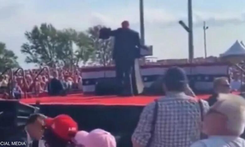 ويظهر الفيديو الذي التقط من خلف ترامب، ظهر المرشح الجمهوري لانتخابات الرئاسة الأميركية أثناء حديثه في تجمع انتخابي، ثم لحظة إطلاق النار وإصابة ترامب في أذنه.