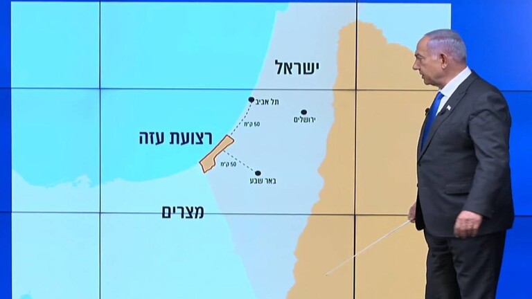وتحدث خلال مؤتمر صحفي عن أهمية سيطرة الجيش الإسرائيلي على محور فيلادلفيا الحدودي بين قطاع غزة ومصر، لكن خلو الخريطة من أي إشارة إلى الضفة كان لافتا.