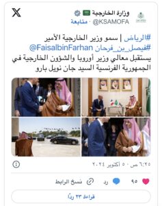 بحث وزير الخارجية السعودي الأمير فيصل بن فرحان، مع نظيره الفرنسي جان نويل بارو، التطورات على الساحة اللبنانية والجهود المبذولة بشأنها.