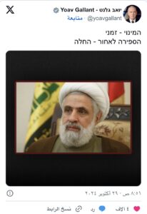 وكتب غالانت عبر حسابه على منصة “إكس”: “لقد بدأ العد التنازلي”. وأرفق التغريدة بصورة نعيم قاسم