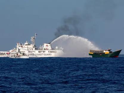 سفينة تابعة لخفر السواحل الصيني تطلق مدافع المياه باتجاه سفينة الإمداد الفلبينية أونايزا أثناء توجهها إلى جزيرة توماس في بحر الصين الجنوبي. 4 مايو 2024 – Reuters
