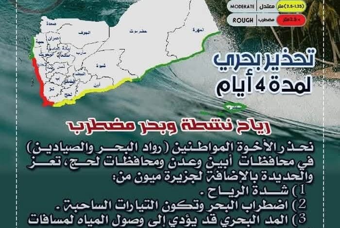 وعليه، نحذر الإخوة المواطنين، من رواد البحر والصيادين، في المحافظات التالية: عدن، أبين، لحج، تعز، الحديدة، بالإضافة إلى جزيرة ميون، من المخاطر التالية: