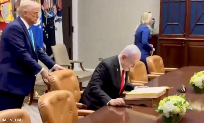 وأظهرت مقاطع فيديو نشرتها وسائل إعلام إسرائيلية ترامب وهو يقوم بتعديل الكرسي لنتنياهو عند جلوسه.