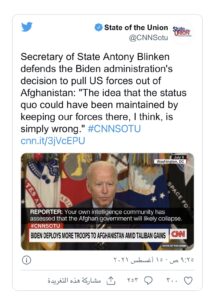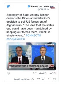 وأقر بلينكن بأن الإنجازات الميدانية الواسعة التي حققتها حركة “طالبان” خلال فترة قصيرة كانت أسرع مما كان متوقعا، مدافعا في الوقت نفسه عن قرار الولايات المتحدة سحب قواتها من البلاد.
