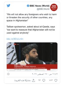 مجاهد الذي كان يتحدث للصحفيين في أول مؤتمر صحفي لطالبان من العاصمة كابل أكد، خلال رده على سؤال عن علاقة حركته بتنظيم القاعدة إن “طالبان لن تسمح لأحد باستغلال التراب الأفغاني لشن هجمات”.