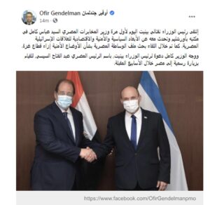 وقال أوفير جندلمان، مدير مكتب رئاسة الوزراء في إسرائيل، عبر منشور على “فيسبوك” إن “بينيت التقى اليوم لأول مرة وزير المخابرات المصري عباس كامل في مكتبه بالقدس وتحدث معه عن الأبعاد السياسية والأمنية والاقتصادية للعلاقات الإسرائيلية المصرية”.