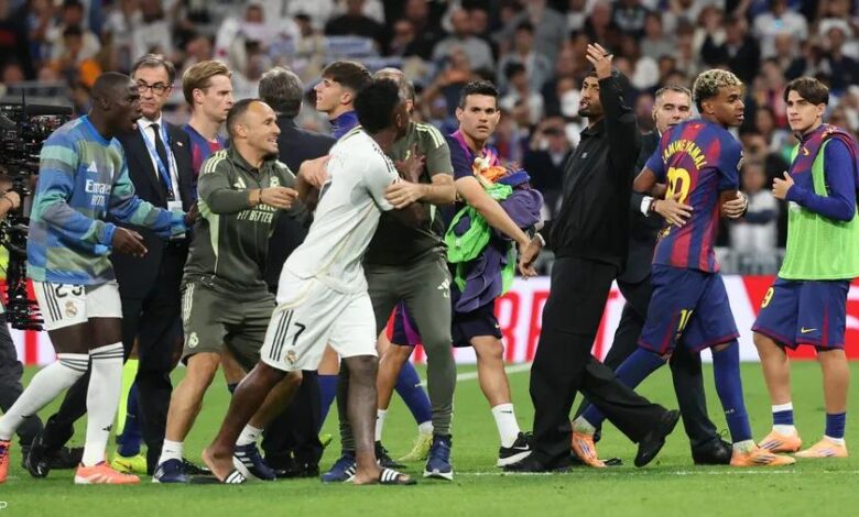 وبينما كان يامال يقترب من النفق المؤدي إلى غرفة الملابس، انضم فينيسيوس جونيور إلى عدد من لاعبي “الملكي”، الذين لحقوا بلاعب برشلونة، وظهرت على وجهه معالم الغضب ووجه بعض الكلمات للاعب “البلوغرانا”.