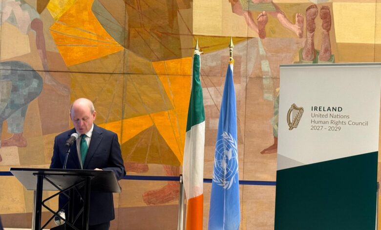 dear friends and colleagues, just building on what the minister said there, I suppose I Want to set up why Ireland is running for the Human Rights Council and why we want the vote of each and every one of their delegations. It’s a year of anniversaries un established, 70 years since Ireland and 15 other nations joined the UN in 1955 and almost 20 years since the Human Rights Council was established. First, and against that backdrop and against the challenging moment we are living in. Ireland wants to use this moment to reiterate our commitment, our D commitment, to the UN and its three pillars into a lasers, indivisible, inseparable and indispensable peace and secure development and human rights in doing in doing so, we’re not blind to the reality of the world we’re living in today. We’re not naive. We can see, you know, that the conflict has proliferated in a way that we just didn’t think imaginable 10 years ago, in far too many situations, from Afghanistan to Ukraine, from Gaza to Sudan and many other situation many of our locations, we see a serious regard for international human rights law and international humanitarian law. We’ve also seen that progress is lagging in implementation Sustainable Development Goals. We see that poverty and conflict and climate change are deeply impacting. Disasters, are driving inequality, are increasing disability in compounding, and interlinked ways, and in a word that we came to the most basic of human needs derived of agriculture is often undermined and threatened. And at the same time, we see a shrinking civic space. We see a silence in critical voices. We see a pushback, in some ways, inserted pushback against the principles of equity, equality and non discrimination. Non discrimination, and we think we can do so much better as an international community. So we recognize the deep responsibility that comes with managing the Human Rights Council. We’re committed to playing our part in shouldering this responsibility, shouldering this burden in the spirit of dialog and discussion on solidarity and partnership, we know to our own I Island experience that human rights bedrock peaceful stable across the societies, human rights are key in building the foundation of peace, justice and reconciliation on the art environment. We also see that the human rights based approach underpins and makes our development assistance programs much more impactful, and that also includes working in an active way, in active engagement with local civil society. Our own human rights framework domestically, like all member states here, is far from perfect. We are mature as all employers. We’re a majority society which embraces equality, inclusion and the full diversity of human life and experience society based on civic, political and economic well being, all are important. All are key. We still have a long way to go, but we have learned on our journey over 100 years of independence that the protection of most of human rights enables much more open and inclusive society that can deliver for all our people to enter his onto this establishment, the Human Rights Council, has, we believe, become a mature institution that makes a substantial contribution to human rights worldwide. It’s known that work deepens our understanding of human rights principles. The Universal Periodic Review provides state reform that share both experiences and its challenges and underpins many forms of technical assistance in its country. Specific work, the council shines a light on serious violations and human rights emergencies. Only last week, it had an American session situation in Sudan, and to its investigation mechanisms, it acts as a powerful force for accountability. So Ireland has put it forward for elections to the Human Rights Council to play our part under all these headings and in all the work of the council and the priority team that we’ve set out that a minister set out in the video will guide us, underpin at all times by our consistent commitment to international human rights law and the universality of human rights, and to conclude we’d be glad to hear, I just want to say darkest moments in our own island story, from the darkest moments in the conflict and the island of Ireland, those of us who were lucky enough to work with this process often sustained ourselves to dark days with what we call a duty of hope. And that’s not just wishful thinking. It’s not sitting under Tracee and Kumbaya. It’s actually, it’s actually a really, really active, active obligation, a shared obligation, to believe and to work to make things better. And that’s what we want to do as a member of the Human Rights Council, to work with all of you and all the members on the council as a shared obligation to make this world a better place for all our peoples. As Minister McGee said, we will continue to be a consistent voice and a committed voice and a committed partner for human rights. We will continue to stand up for human rights, and we will continue to stand up for our United Nations, and is on this basis that we see your support, all of your support, for our candidacy for the Human Rights Council. 2027 2029 Thank you very much. Please.