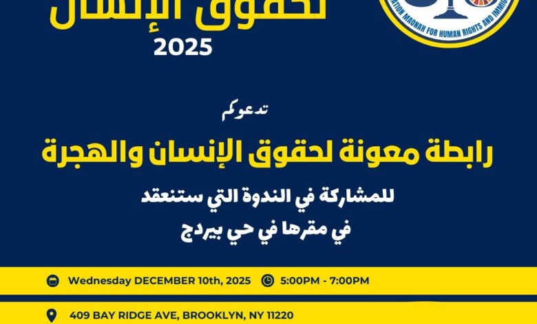 تتشرف منظمة (AMHRI) رابطة معونه لحقوق الإنسان والهجرة دعوتكم الى حضور الاحتفال الذي ستنظمه الرابطة بمناسبة اليوم العالمي لحقوق الإنسان، والذي سيقام في مقر الرابطة بمدينة نيويورك في الزمان والمكان الموضح أدناه.